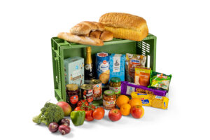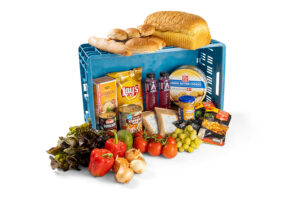 Een krat met onder andere verse groente van fruit, macaroni, rijst, groenten in blik, tomatensaus en koekjes. We proberen om elke week producten voor 3 complete maaltijden in het pakket te doen. Dat lukt niet altijd omdat we moeten afwachten wat we krijgen. Uw pakket is bedoeld als een aanvulling op uw eigen boodschappen.